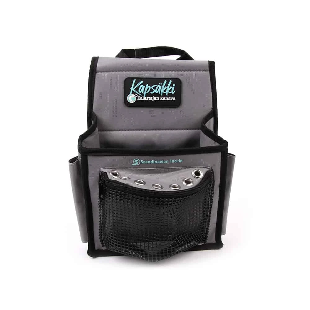 Kapsäkki pitää kalastajan tarvitsemat tärkeimmät välineet veneessä aina käden ulottuvilla.Kapsäkki on kätevä kalastajan tarvikekassi. Kapsäkki toimii erinomaisesti kalastettaessa veneestä käsin. Kassin takana on on tarrakiinnike, jolla sen saa veneen kaiteeseen tai hankaimeen. Laita tärkeimmät työkalut kassin pieniin taskuihin, isommat päätaskuun ja erikoisemmat verkkotaskuun. Kalasta pois lähdettäessä laukku lähtee helposti mukaan kätevän tarrakiinnityksen ansiosta. Materiaalit 1000D ja 600D polyesteriä. Renkaat rosteria.Kapsäkki on Kalastajan kanavan kanssa yhteistyössä suunniteltu ja väriteema on tehty kanavan mukaan.